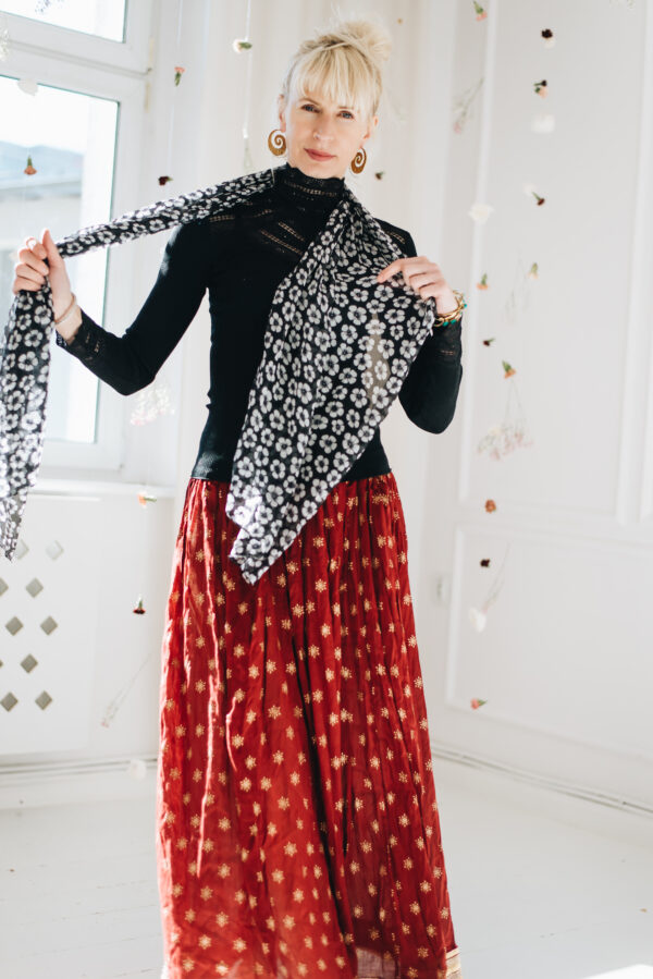 Piękne szale z Indii, wykonane z jedwabiu. Każdy z szali indyjskich ma niepowtarzalny wzór oraz kolor.Jakość jest wyjątkowa, są one miękkie i delikatne w dotyku. Doskonale sprawdzają się o każdej porze roku, są pięknym uzupełnieniem każdej stylizacji.