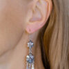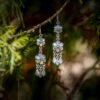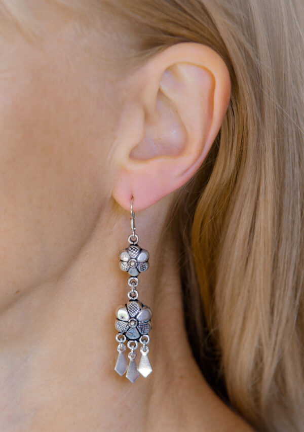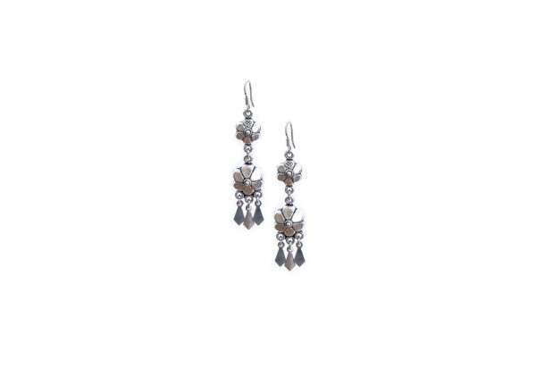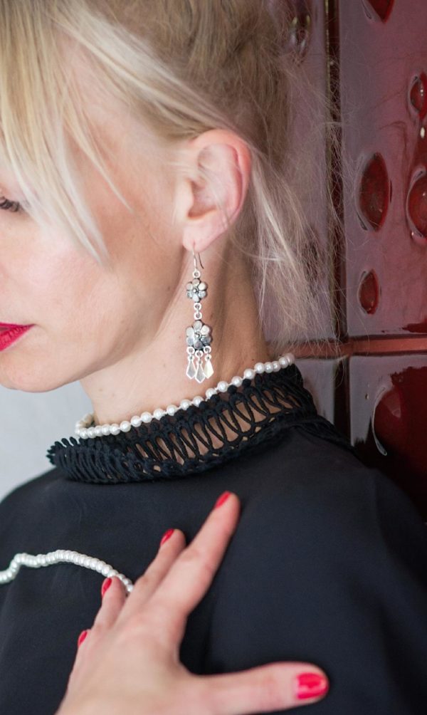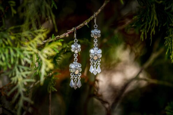 Dwa kwiaty, różnej wielkości, połączone ze sobą i zakończone wisiorkami, prezentują się niezwykle pięknie na uchu każdej kobiety. Dodatkowo kompozycja kwiatowa dodaje subtelności i wyodrębnia piękno oraz delikatność każdej kobiety. Swoim płynnym ruchem biżuteria przykuwa uwagę. Niezwykły dodatek do każdej stylizacji.
