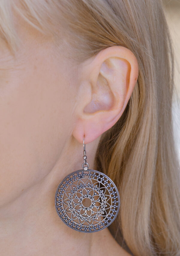 Mandala w kulturze indyjskiej jest symbolem kręgu życia, wyróżnia się ona efektownym wzornictwem i detalami.Detale w kolczykach są dopracowane do perfekcji.Kwiatowy motyw inspirowany mandalą zamknięty w oprawie koła uwydatnia piękno oraz unikalność. Kompozycja ta będzie się cudownie prezentować na każdej kobiecie i doda ponadczasowego wyglądu, który czasami tak trudno uzyskać