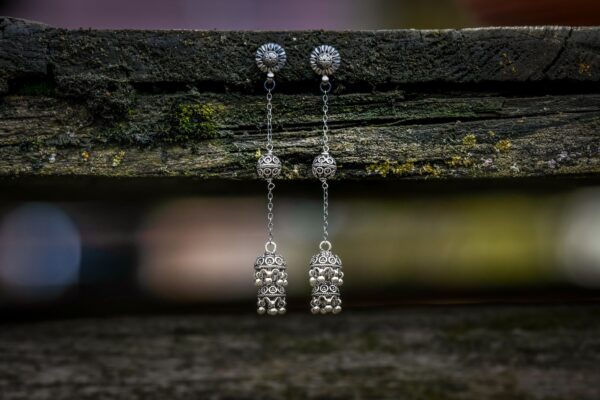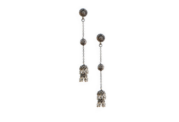 Wyjątkowe kolczyki które dodadzą niepowtarzalnego stylu każdej kobiecie uwidaczniają połączenie dwóch kultur wschodniej i zachodniej. Subtelne połączenia łańcuszkiem dwóch dzwonków, srebrnej kulki z wyrafinowanymi detalami oraz sztyftu z kompozycją kwiatową nadają kolczykom finezji. Dzwonki nawiązujące do tradycji indyjskiej dodają całości efektownej stylizacji oraz zaskoczenia.Detale które są uwydatnione w kolczykach pokazują nową i wyjątkową odsłonę biżuterii.Model posiada zapięcie na sztyft.