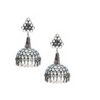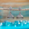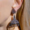 Śmiałe i stylowe srebrne kolczyki z kryształami. Górna część w kształcie trójkąta ozdobiona kryształami połączona jest ze srebrnym słupkiem który pokryty jest wzorem nawiązującym do kultury indyjskiej.Dzwonek nadaje całości efekt czaru i  finezji .Zakończone frędzlami zamykają całość w przepiękny komplet ręcznie robionej biżuterii. Eleganckie kolczyki łączą w sobie klasyczny blask bezbarwnego kryształów.Świetnie będą się komponować z najnowszymi trendami dodając wschodniego akcentu.