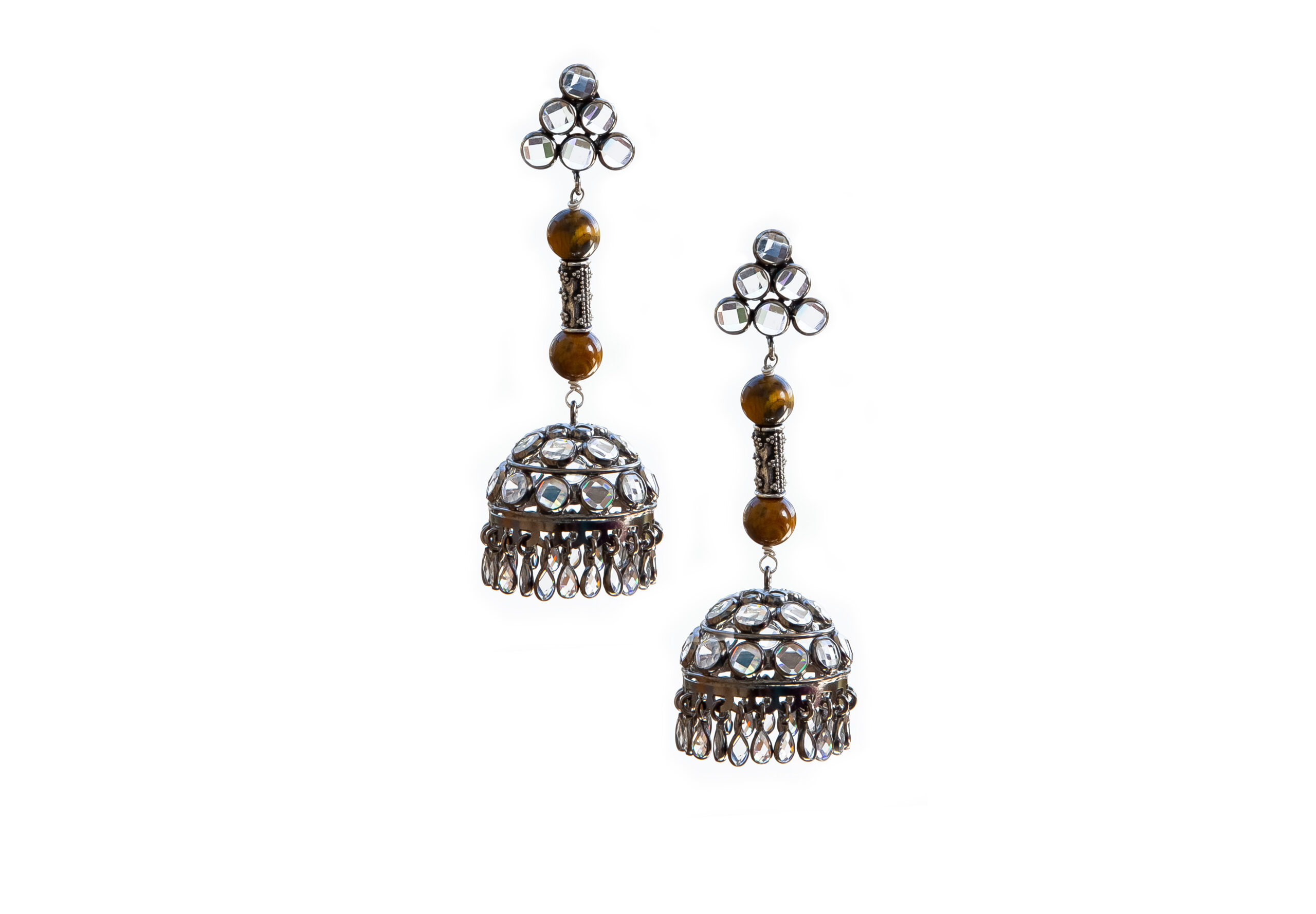 Tygrysie oko to kamieni , który uzmysławia nam, że jedyną pewną rzeczną w życiu jest ruch, natomiast złocistobrązowy kolor związany jest z energią ognia. Zawarty blask, płynność oraz ruch  w kolczykach doda  wyjątkowości każdej kobiecie.Biżuterie wykonano z kryształów które mieniąc się podkreślają nieoczywiste kształty kolczyków.Połączenie dzwonka, który jest charakterystyczny dla indyjskiej kultury z blaskiem kryształów wzbudzi zainteresowanie i żadna kobieta nie przejdzie nie zauważona.