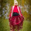 Zwiewna, orginalna o pięknym kolorze spódnica z delikatnym wzorem nawiązującym do architektury Indii.Soczysty kolor, unikatowe zdobienie na dole spódnicy dodają jej niepowtarzalnego wyglądu przed co nie sposób przejść niezauważoną. Delikatne dzwonki przytwierdzone w pasie dodają jej charakteru indyjskiego.