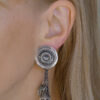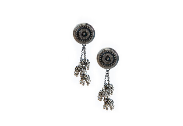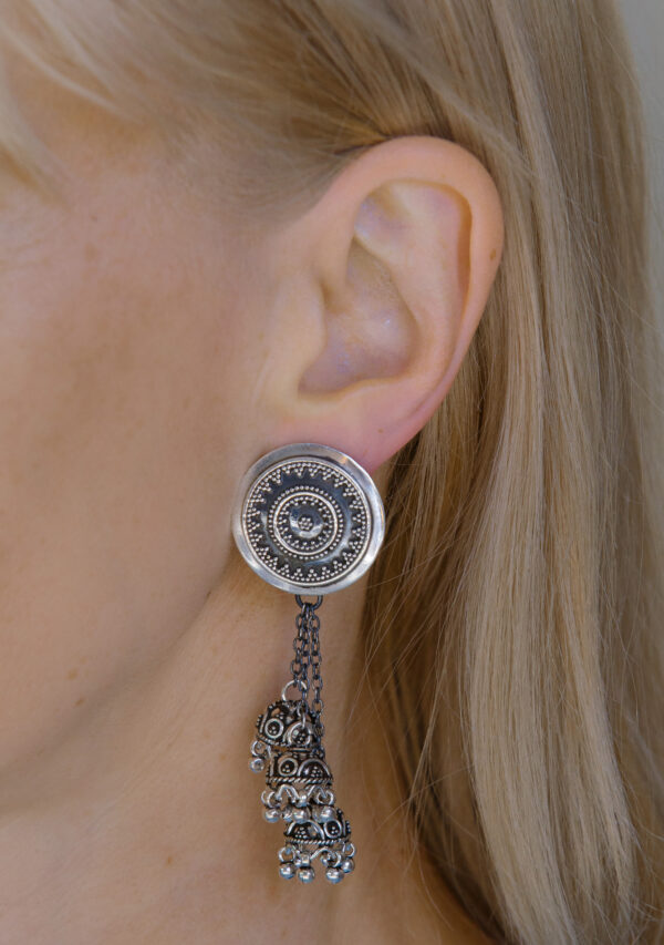 Oryginalne kolczyki, zachwycają swoim wyglądem oraz kształtem.Koła posiadają etniczny wzór który wspaniale komponuje się z całością.Trzy dzwonki na łańcuszkach stanowią nieodzowny element kolczyków które dodadzą płynności biżuterii. Nieoczywisty rozmiar oraz kształt uzupełnieni każdą stylizacje w nieopisaną finezje oraz ukaże świadomy styl każdej kobiety.Model posiada zapięcie na sztyft.